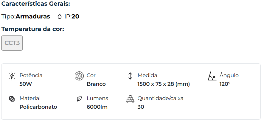 43554 | 50W | Branco | Policarbonato | CCT3 | 6000lm | 1500 x 75 x 28 | 120° |