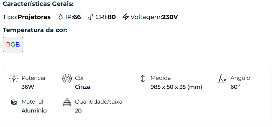 | 39779 | 36W | Cinza | Alumínio | RGB | 985 x 50 x 35 | 60° |
