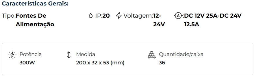 Fonte de Alimentação Transformador Slim IP20 Multivoltagem 12V/24V - Deteção Automática 300W - R-electric