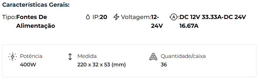Fonte de Alimentação Transformador Slim IP20 Multivoltagem 12V/24V - Deteção Automática 400W - R-electric