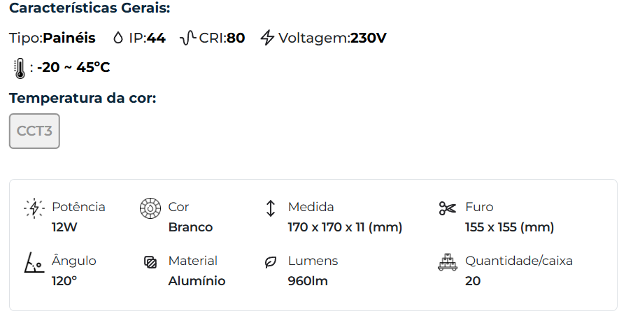 | 42939 | 12W | 155 x 155 | Branco | Alumínio | CCT3 | 960lm | 170 x 170 x 11 | 120° |