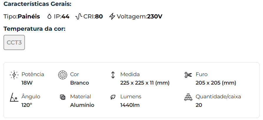 | 42946 | 18W | 205 x 205 | Branco | Alumínio | CCT3 | 1440lm | 225 x 225 x 11 | 120° |