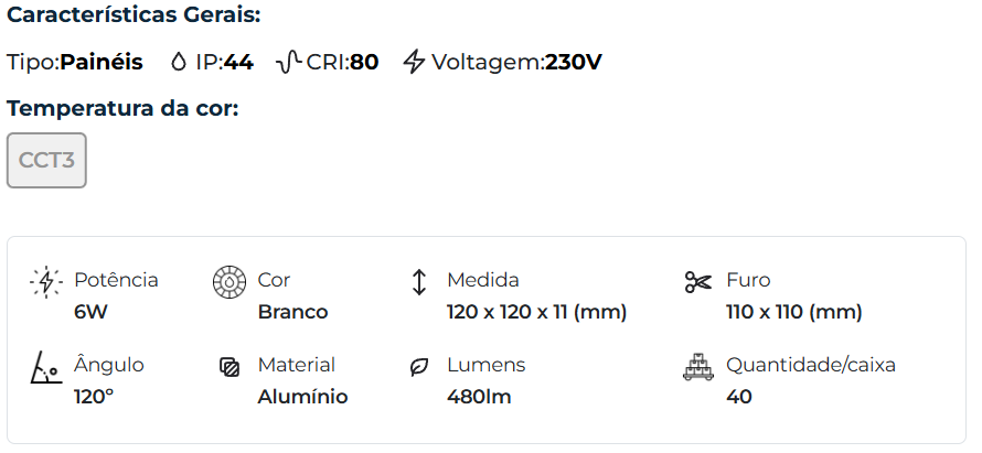 | 42915 | 6W | 110 x 110 | Branco | Alumínio | CCT3 | 480lm | 120 x 120 x 11 | 120° |