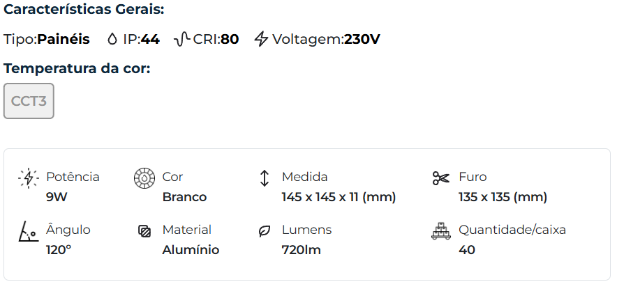 | 42922 | 9W | 135 x 135 | Branco | Alumínio | CCT3 | 720lm | 145 x 145 x 11 | 120° |